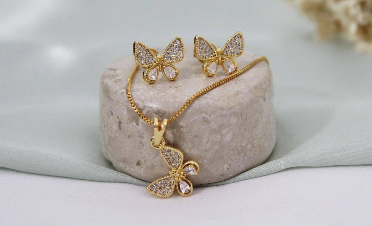 CONJUNTO BORBOLETA CRAVEJADO NA MICRO ZIRCÔNIA BANHADO A OURO 18K