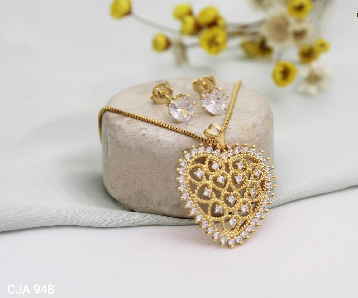 / CONJUNTO BRINCO E COLAR CORAÇÃO COM ZIRCÔNIA BANHADO A OURO 18K