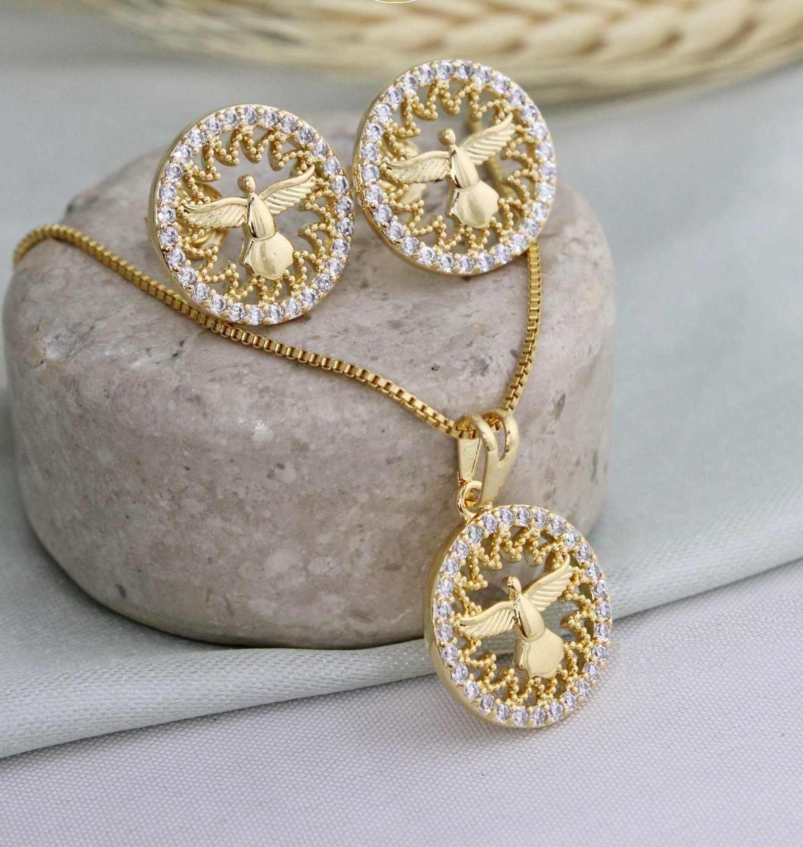 CONJUNTO BRINCO E COLAR ESPÍRITO SANTO BANHADO A OURO 18K