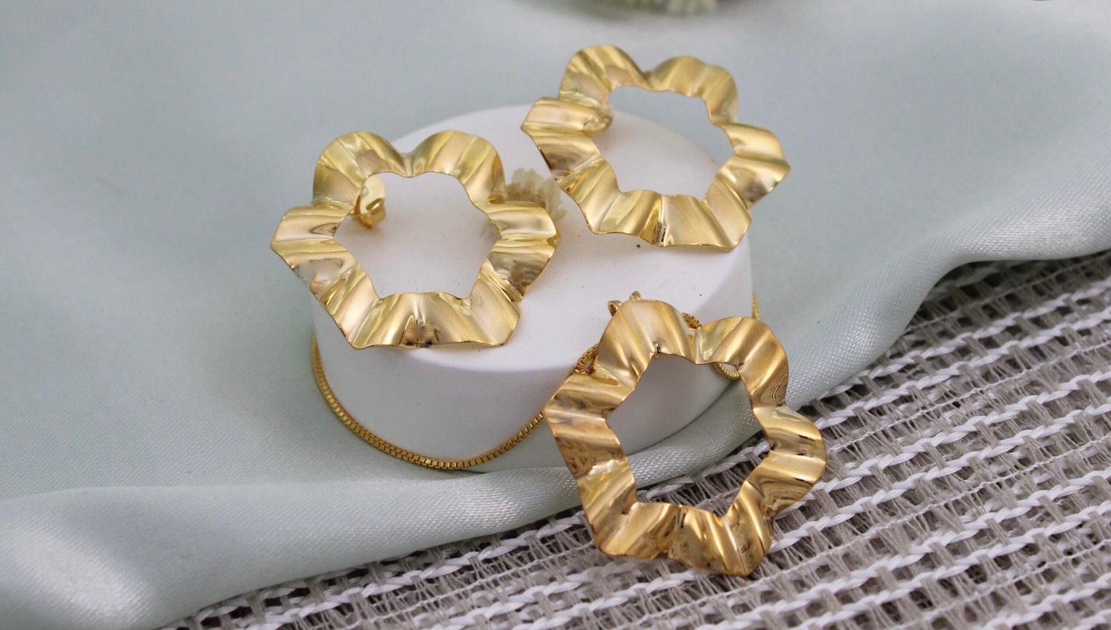 CONJUNTO BRINCO E COLAR FLOR VAZADO BANHADO A OURO 18K quantidade