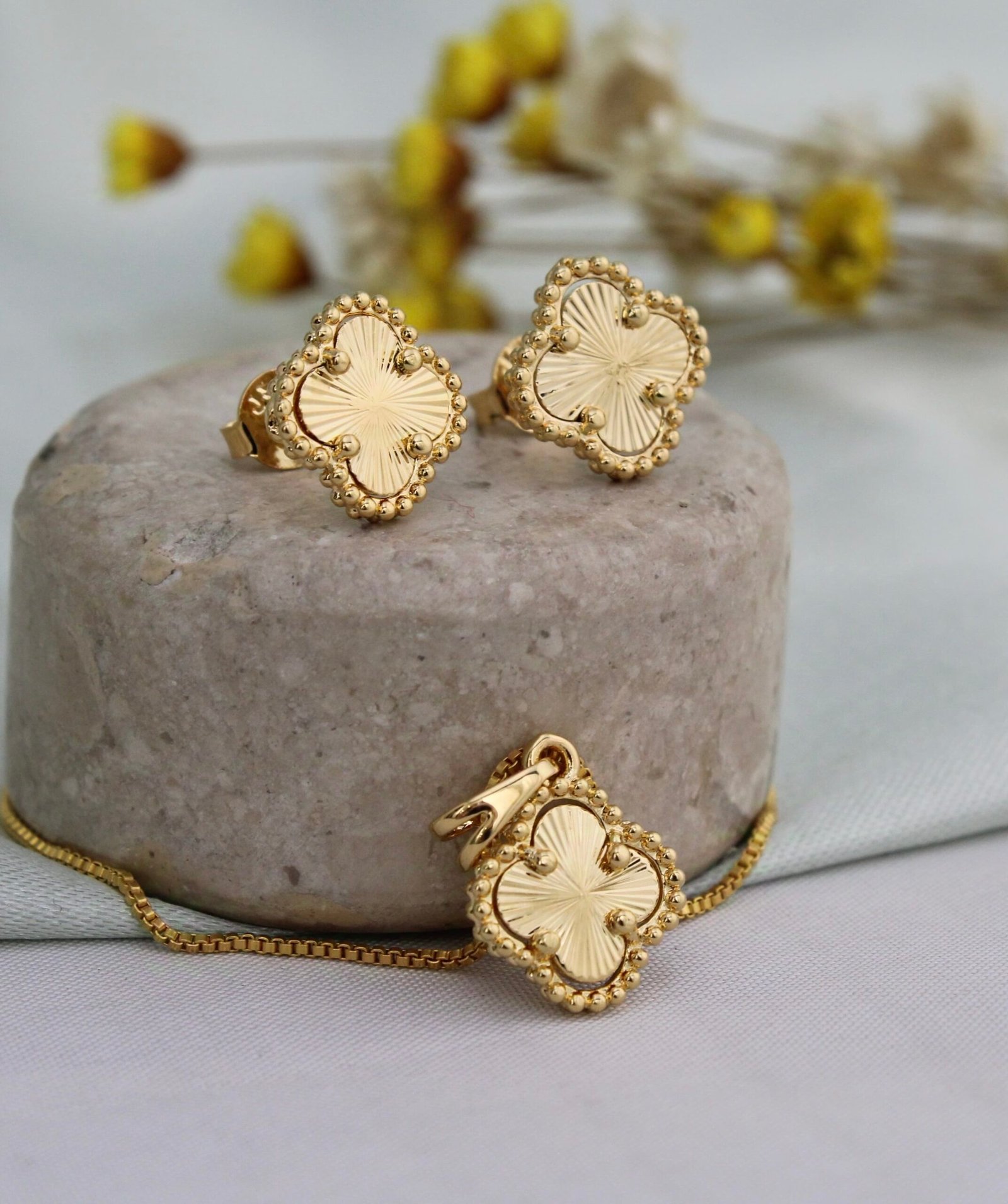 CONJUNTO BRINCO E COLAR TREVO DOURADO BANHADO A OURO 18K